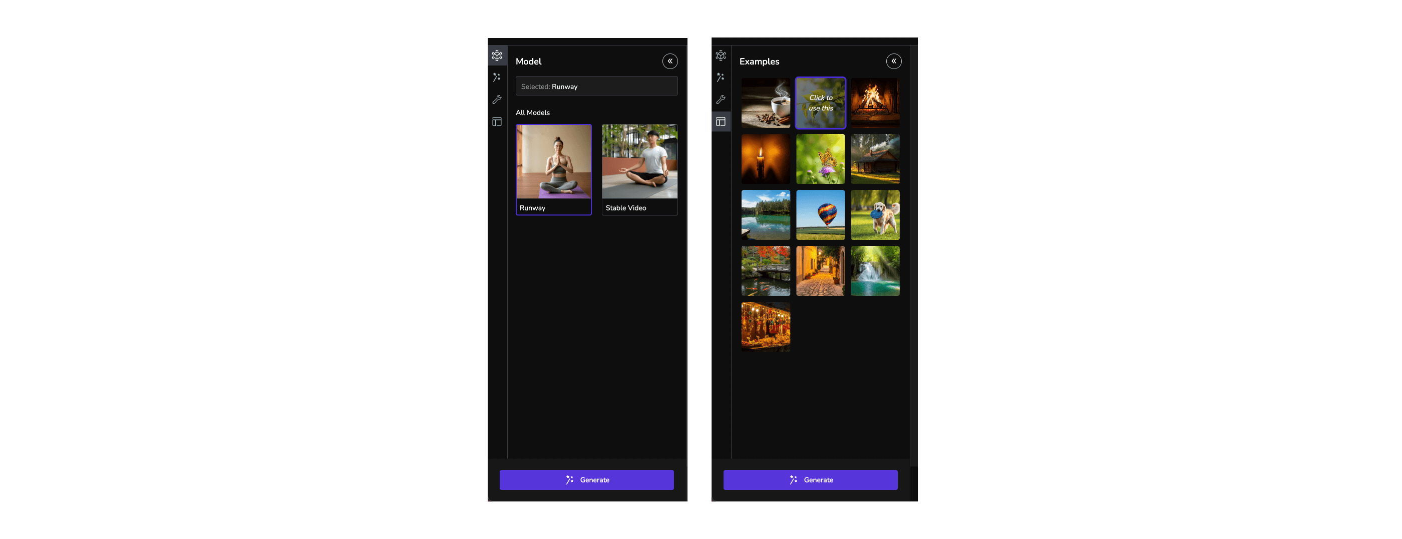 The main video generation tool offers features tailored to specific models. For models like Luma and Runway, we provide options for setting Start and End frames, allowing users to upload images for these parameters. However, models such as Stable Video do not support End frames or Text prompts. To maintain consistency across the platform's UI, these unsupported inputs are disabled when Stable Video is selected.