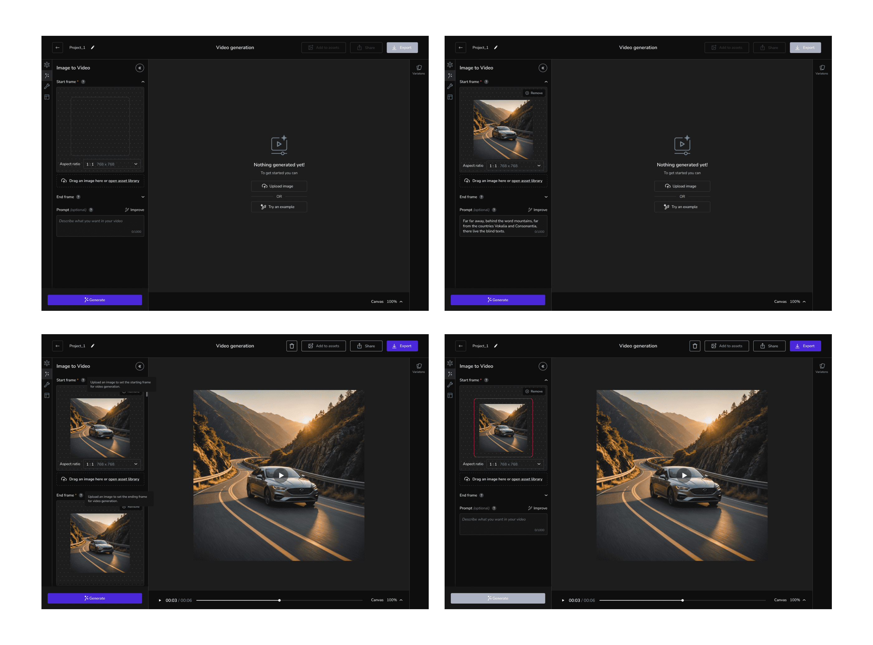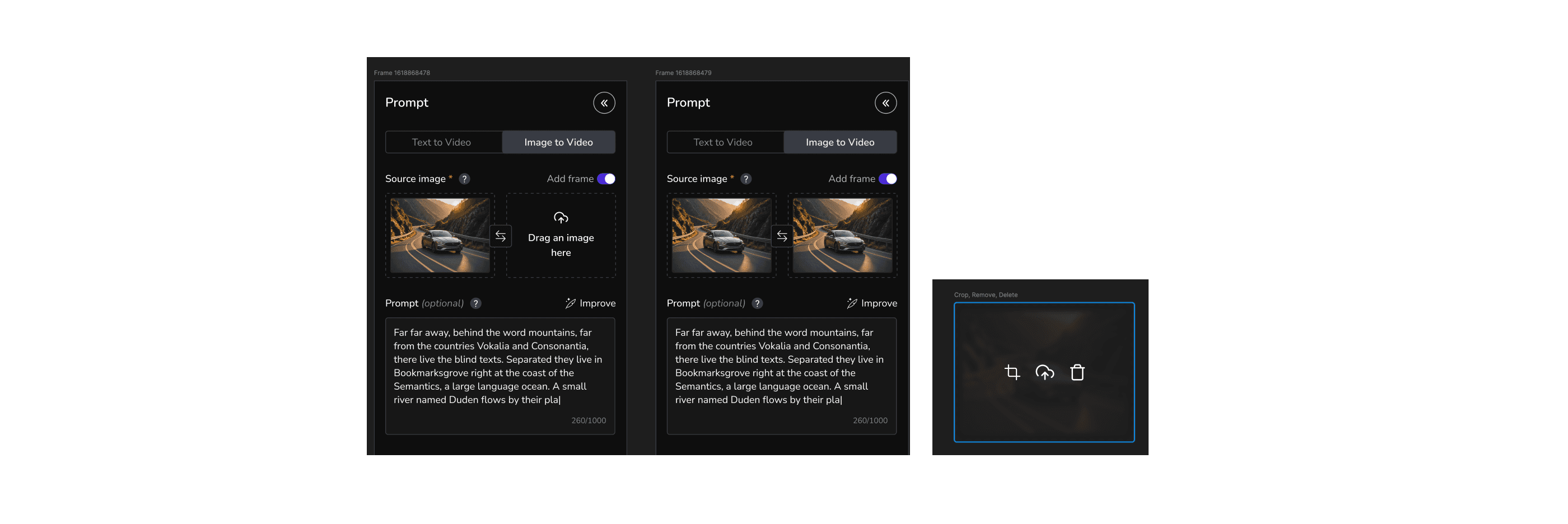 I designed a variation for the frame upload feature, allowing users to choose whether to add a frame, thereby saving space in the left panel. This variation also included options to swap images for the start and end frames, along with new interactions for re-uploading, deleting, and cropping images. However, implementing this as a completely new component would significantly increase development time, especially since we only had one front-end developer. Additionally, there were challenges with swapping images and some API errors. As a result, we decided to discard the idea for now. However, the founders appreciated the concept, and we may revisit this UI in the future.