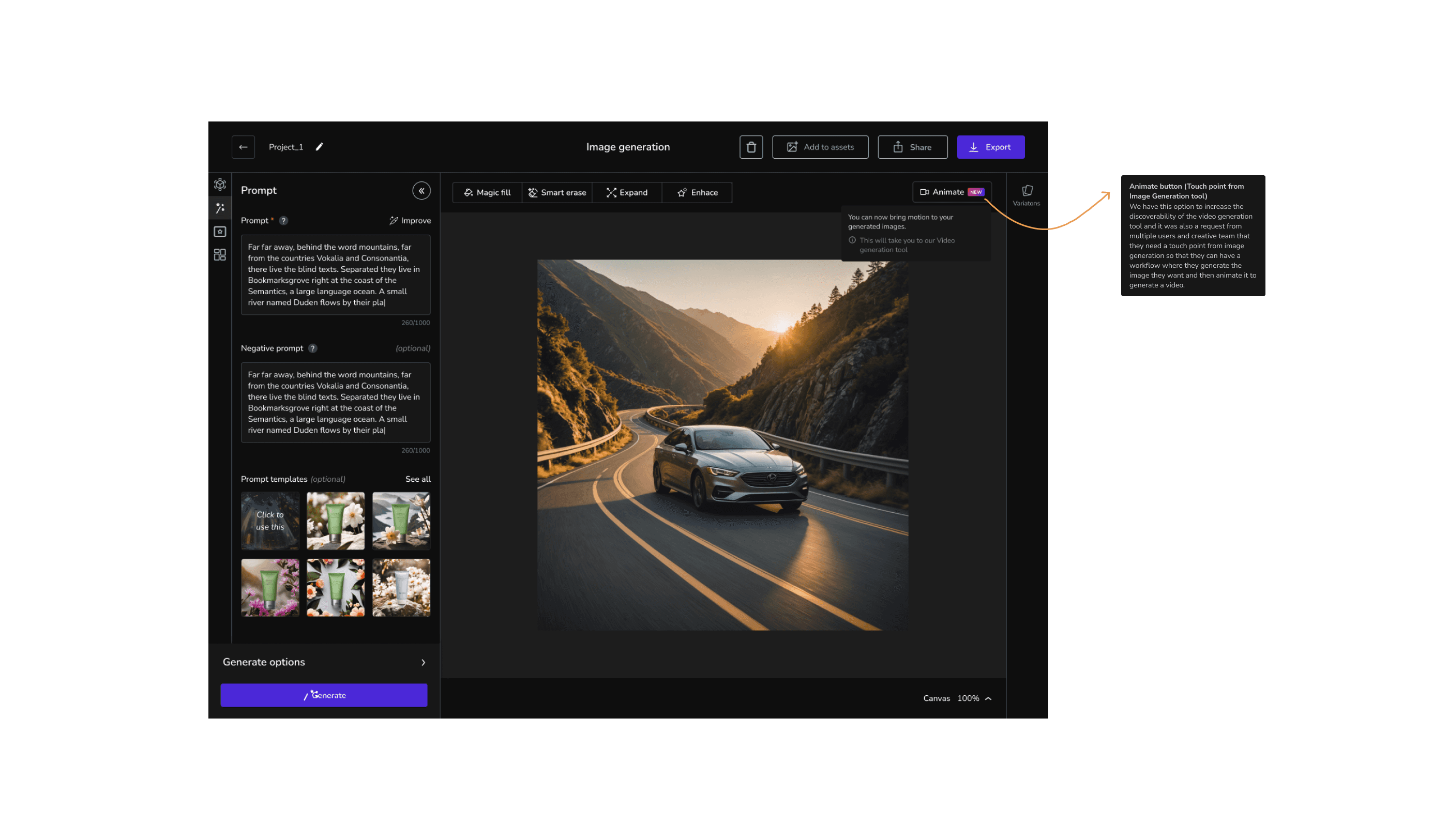 The "Animate" button (Touchpoint from Image Generation tool) was introduced to improve the discoverability of the video generation tool. This feature was implemented in response to requests from multiple users and the creative team, enabling a seamless workflow where users can generate the desired image and then animate it to create a video.